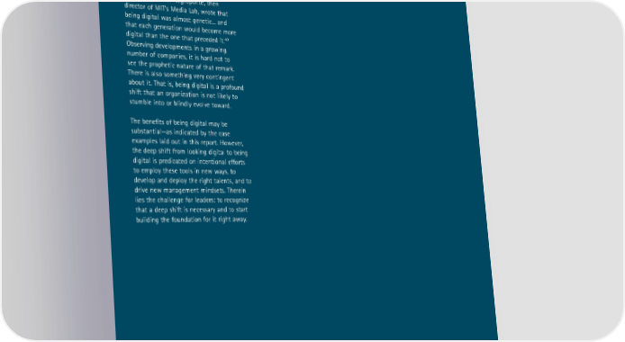 From Looking Digital to Being Digital: The Impact of Technology on the Future of Work Conclusion In 1996, Nicholas Negroponte, then director of MIT’s Media Lab, wrote that being digital was almost genetic... and that each generation would become more 40 digital than the one that preceded it. Observing developments in a growing number of companies, it is hard not to see the prophetic nature of that remark. There is also something very contingent about it. That is, being digital is a profound shift that an organization is not likely to stumble into or blindly evolve toward. The benefits of being digital may be substantial—as indicated by the case examples laid out in this report. However, the deep shift from looking digital to being digital is predicated on intentional efforts to employ these tools in new ways, to develop and deploy the right talents, and to drive new management mindsets. Therein lies the challenge for leaders: to recognize that a deep shift is necessary and to start building the foundation for it right away. 40 | Accenture | Copyright 2014 Accenture. All rights reserved. ©