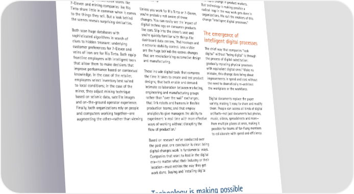 From Looking Digital to Being Digital: The Impact of Technology on the Future of Work And yet, while this deep shift in the way human and machine as mutually exclusive technology will not accomplish the task people work may not be obvious to the sources of knowledge. That’s why, in both any more than buying exercise equipment untrained eye, it’s already going on in some instances, veteran employees with working will make you healthy. Technology by itself companies. Take, for instance the changes knowledge—know-how—find digital won’t enable a company to keep pace that have happened in recent years in technology a source of stimulation, with rapid change in product markets. two very different industries: retailing and not insecurity. But technology is making possible a iron ore mining. Convenience stores like radical leap in the way work gets done in 7-Eleven and mining companies like Rio Unless you work for Rio Tinto or 7-Eleven, organizations. We call the enablers of this Tinto share little in common when it comes you’re probably not aware of these change “intelligent digital processes.” to the things they sell. But a look behind changes. You can easily see the impact of the scenes reveals surprising similarities. digital technology on consumer products like cars. Slip into the driver’s seat and The emergence of Both scan huge databases with you’re quickly familiar with things like intelligent digital processes sophisticated algorithms in search of dashboard data centers, iPod hookups and clues to hidden treasure: underlying electronic stability control. Less visible The chief way that companies “look customer preferences for 7-Eleven and are the huge behind-the-scenes changes digital” without “being digital” is through veins of iron ore for Rio Tinto. Both equip that are revolutionizing automotive design the process of digital substitution: frontline employees with intelligent tools and manufacturing. gradually replacing physical processes 3 that allow them to make decisions that with equivalent digital ones. Make no improve performance based on contextual These include digital tools that compress mistake, this change does bring about knowledge. In the case of the retailer, the time it takes to create and test product improvements in speed and cost without employees select inventory best suited designs; that both enable and demand the need to dramatically re-architect to local conditions; in the case of the intimate collaboration between marketing, the workplace or the workforce. miner, they adjust mining technique engineering and manufacturing groups based on seismic data, satellite images rather than “over the wall” exchanges; Digital documents replace the paper and on-the-ground operator experience. that link robots and humans in flexible variety, making it easy to share and modify Finally, both organizations rely on people production teams; and that employ them. People can access all kinds of digital and computers working together—one analytics to give managers the ability to artifacts—not just documents but photos, augmenting the other—rather than viewing experiment in real time with more effective music, videos, spreadsheets and more— ways of working without disrupting the from multiple places at once, making it 2 flow of production. possible for teams of far-flung members to collaborate with speed and efficiency. Based on research we’ve conducted over the past year, one conclusion is clear: being digital changes work in fundamental ways. Companies that want to lead in the digital era—no matter what their industry or their location—must rethink the way they get work done. Buying and installing digital Technology is making possible a radical leap in the way work gets done in organizations. 10 | Accenture | Copyright 2014 Accenture. All rights reserved. ©
