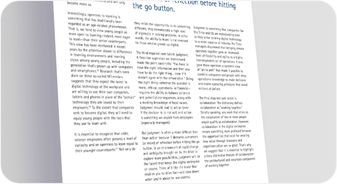From Looking Digital to Being Digital: The Impact of Technology on the Future of Work Second, the ability to learn. Experimentation Judgment is often a more difficult is random motion if it’s not fueled by curiosity and the ability to retain what’s feat than action because it demands been discovered. Learning is compulsory in the digital enterprise because the pressure a moment of reflection before hitting to improve performance—both of products and processes—is relentless and will only the go button. become more so. Interestingly, openness to learning is something that has traditionally been they relish the opportunity to do something Judgment is something that companies like regarded as an age-related phenomenon. different, they demonstrate a high level Rio Tinto and GE are rediscovering even That is, we tend to view young people as of ingenuity in solving problems. In other as they strive to bring digital technology more open to learning—indeed, more eager words, the ability to learn is not reserved to a wider expanse of industry. Rio Tinto to learn—than their senior counterparts. to those who’ve grown up digital. managers discovered that bringing remote This view has been reinforced in recent operators together gave an increased years by the attention drawn to differences The third required core talent: judgment. level of flexibility and agility to a highly in learning environments and learning A first-line supervisor we interviewed interdependent set of operations. It also styles among young people, including the made the point succinctly: “You have to gave those operators a systemic view generation that’s grown up with computers have the right information and then you of “pit to port” that made it possible to 35 and smartphones. Research that’s been have to do the right thing… even if it combine computers and people with deep done on these so-called Millennials doesn’t agree with the information.” Doing operational knowledge to make decisions suggests that they expect the latest in the right thing—whether the question is and evolve operating principles that saved digital technology at the workplace and moral, ethical, operational or financial— millions of dollars. are willing to use their own computers, requires the ability to balance evidence tablets and phones in place of the “archaic” and potential consequences, along with The final required core talent is technology they are issued by their a working knowledge of local values. collaboration. The dictionary defines employers.36 To the extent that companies Judgment should lead to action (even collaboration as “working together.” seek to become digital, they will need to if the decision is to not act) and action Strictly speaking, any work that relies on equip young people with the tools that is something we expect from employees the cooperation of two or more people they use to learn with. (especially managers). would qualify as collaboration. However, collaboration in the digital enterprise It is essential to recognize that older, But judgment is often a more difficult feat means something more profound because veteran employees often possess a level of than action because it demands a moment the opportunities that exist for creating curiosity and an openness to learn equal to (or more) of reflection before hitting the go new value through discovery and 37 their younger counterparts. Not only do button. In an environment of rapid change experimentation are so great. That’s why and ambiguity brought on by the drive to we suggest that it is essential to highlight explore more possibilities, judgment will be a truly distinctive feature of collaboration: the talent that keeps the digital enterprise the unstructured and voluntary component on course. Think of it like the brake that of working together. enables you to drive fast—and slow down when you’re about to lose control. 35 | Accenture | Copyright 2014 Accenture. All rights reserved. ©