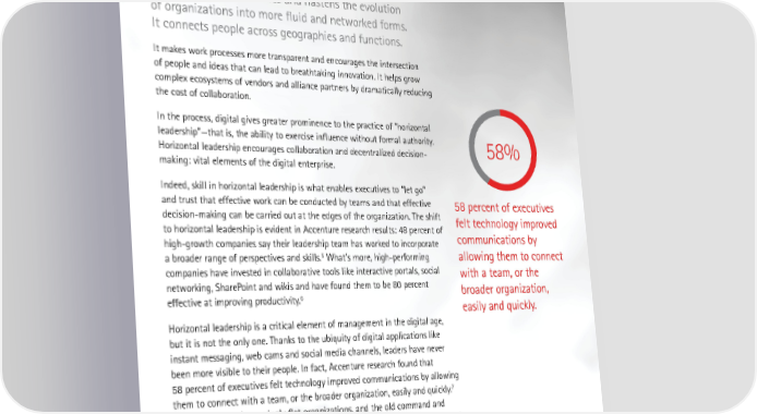Redefining the role of leadership Like water, digital technology insinuates itself into every nook and crevice of an organization. Digital breaks down silos and hierarchies and hastens the evolution of organizations into more fluid and networked forms. It connects people across geographies and functions. It makes work processes more transparent and encourages the intersection of people and ideas that can lead to breathtaking innovation. It helps grow complex ecosystems of vendors and alliance partners by dramatically reducing the cost of collaboration. In the process, digital gives greater prominence to the practice of “horizontal leadership”—that is, the ability to exercise influence without formal authority. 58% Horizontal leadership encourages collaboration and decentralized decision- making: vital elements of the digital enterprise. Indeed, skill in horizontal leadership is what enables executives to “let go” and trust that effective work can be conducted by teams and that effective 58 percent of executives decision-making can be carried out at the edges of the organization. The shift felt technology improved to horizontal leadership is evident in Accenture research results: 48 percent of communications by high-growth companies say their leadership team has worked to incorporate 5 a broader range of perspectives and skills. What’s more, high-performing allowing them to connect companies have invested in collaborative tools like interactive portals, social with a team, or the networking, SharePoint and wikis and have found them to be 80 percent broader organization, 6 effective at improving productivity. easily and quickly. Horizontal leadership is a critical element of management in the digital age, but it is not the only one. Thanks to the ubiquity of digital applications like instant messaging, web cams and social media channels, leaders have never been more visible to their people. In fact, Accenture research found that 58 percent of executives felt technology improved communications by allowing 7 them to connect with a team, or the broader organization, easily and quickly. Couple this with increasingly flat organizations, and the old command and control style of management is rendered more and more old-fashioned. Instead, leaders who communicate their priorities, goals and expectations directly to employees have more opportunities to engage directly with them through social and collaboration platforms. This can encourage meritocracy by tapping employees throughout the organization for the best ideas. 5 | Humanizing work through digital