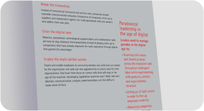 Three fundamental changes To become more agile, accommodate changing worker demands, and harness the new open talent economy, organizations will increasingly change in three fundamental ways: Break the hierarchies Instead of hierarchical command and control units, companies should resemble interconnected networks. Ecosystems of companies, third-party suppliers and independent agents that hold specialized skills and workers Paradoxical who define their own jobs. leadership in the age of digital Enter the digital race Robotics, automation, technological augmentation, and collaboration tools Leaders need to manage are here to stay. Embrace them proactively instead of playing catch up to paradox in the digital competitors that have already improved the work experience through digital. age by: And gained the advantages. • Guarding core values Enable the multi-skilled worker and shared purpose Coach and enable employees to constantly develop new skills that are needed across the ecosystem and by the organization and seek out new opportunities to create value for their throughout contingent organizations. And have them focus on human skills that will reign in the labor while experimenting age of the machine—developing capabilities machines won’t likely take over: with products, services ideation, communication, analysis, experimentation, and the ability to and organizational make sense of data. structure • Letting go of tight control in order to free up employee creativity • Mastering complexity but guiding through simple rules • Exercising judgment in the face of an unprecedented volume of information 6 | Humanizing work through digital